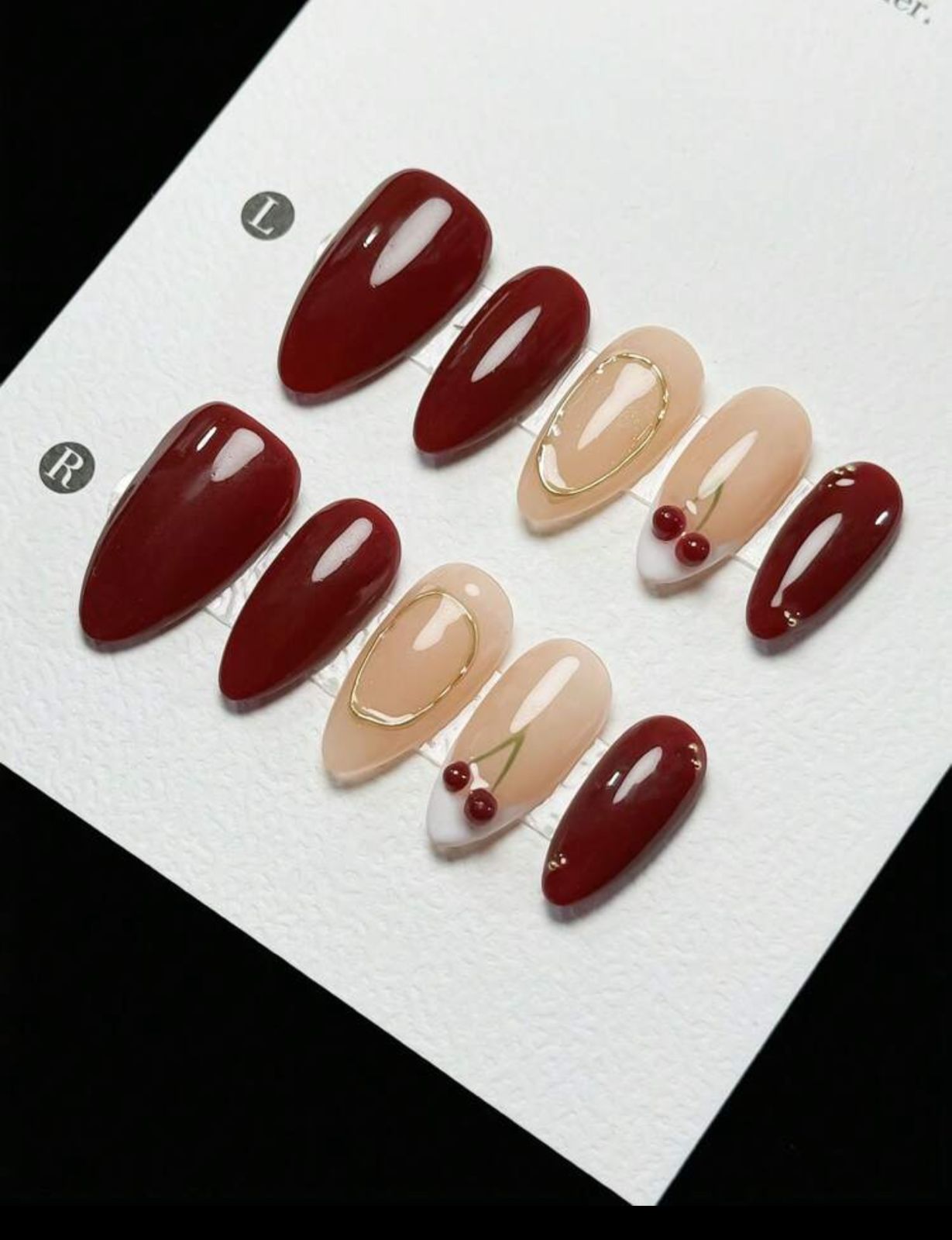 10Pcs Pure Handmade Sexy Dark Red Gold Line Coil White 3D French Style Cherry Almond Shaped Press-On Nails, Premium High-End Luxury Nail Supplies Nails