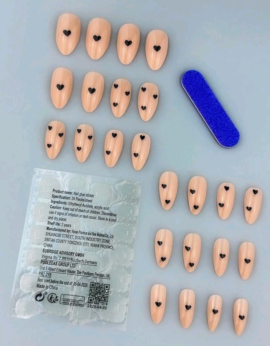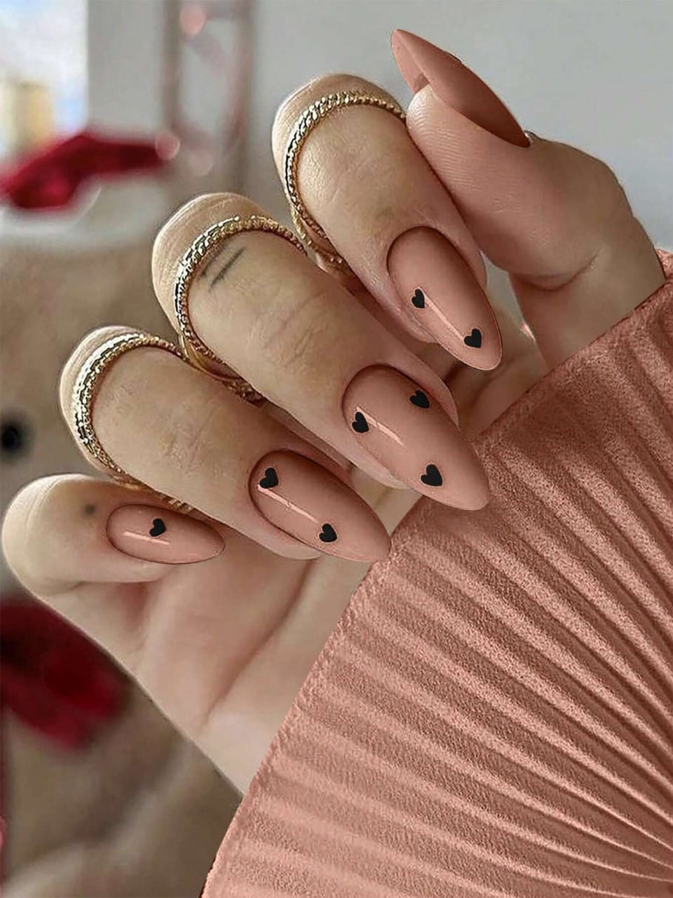 24pcs Medium-Long Almond Shape Black, Coffe & Heart Decor Full Cover False Nails For Women And Girls Press On Nails Nail Supplies