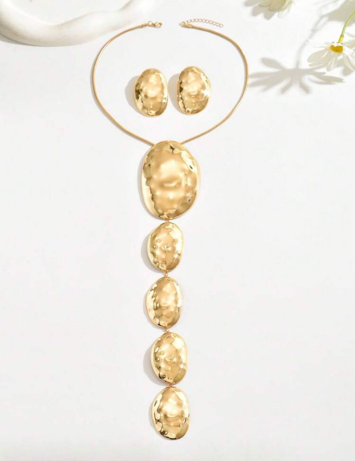 2pcs/Set Metallic Geometric Asymmetrical Hammered Texture Graduated Size Extra Long Pendant Necklace & Earrings Jewelry Set