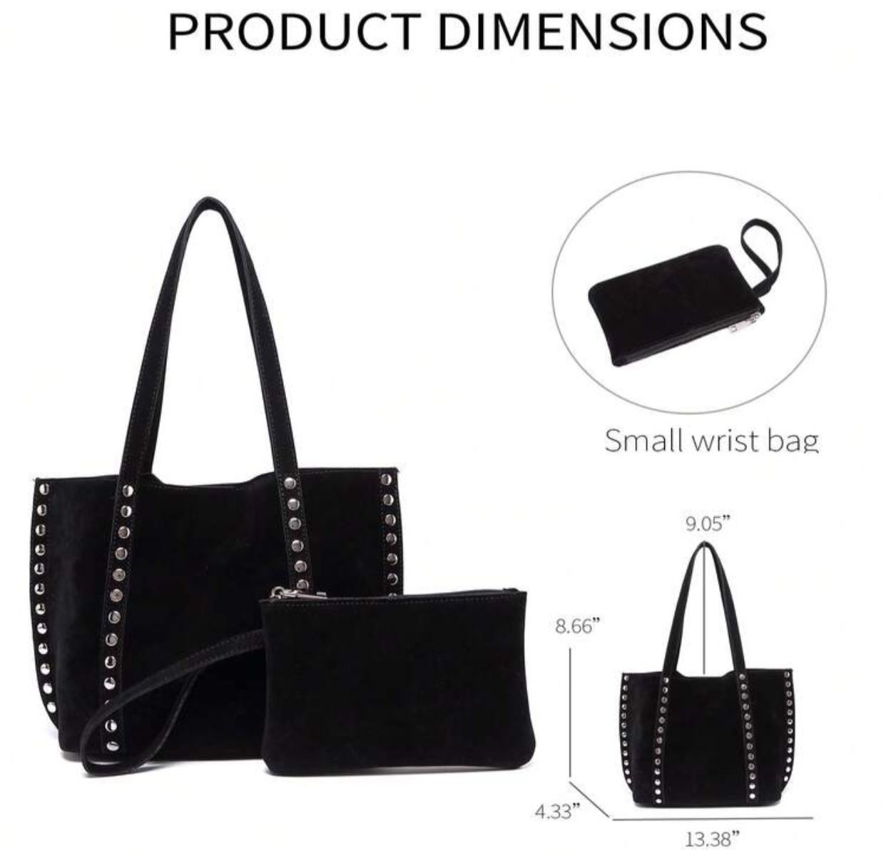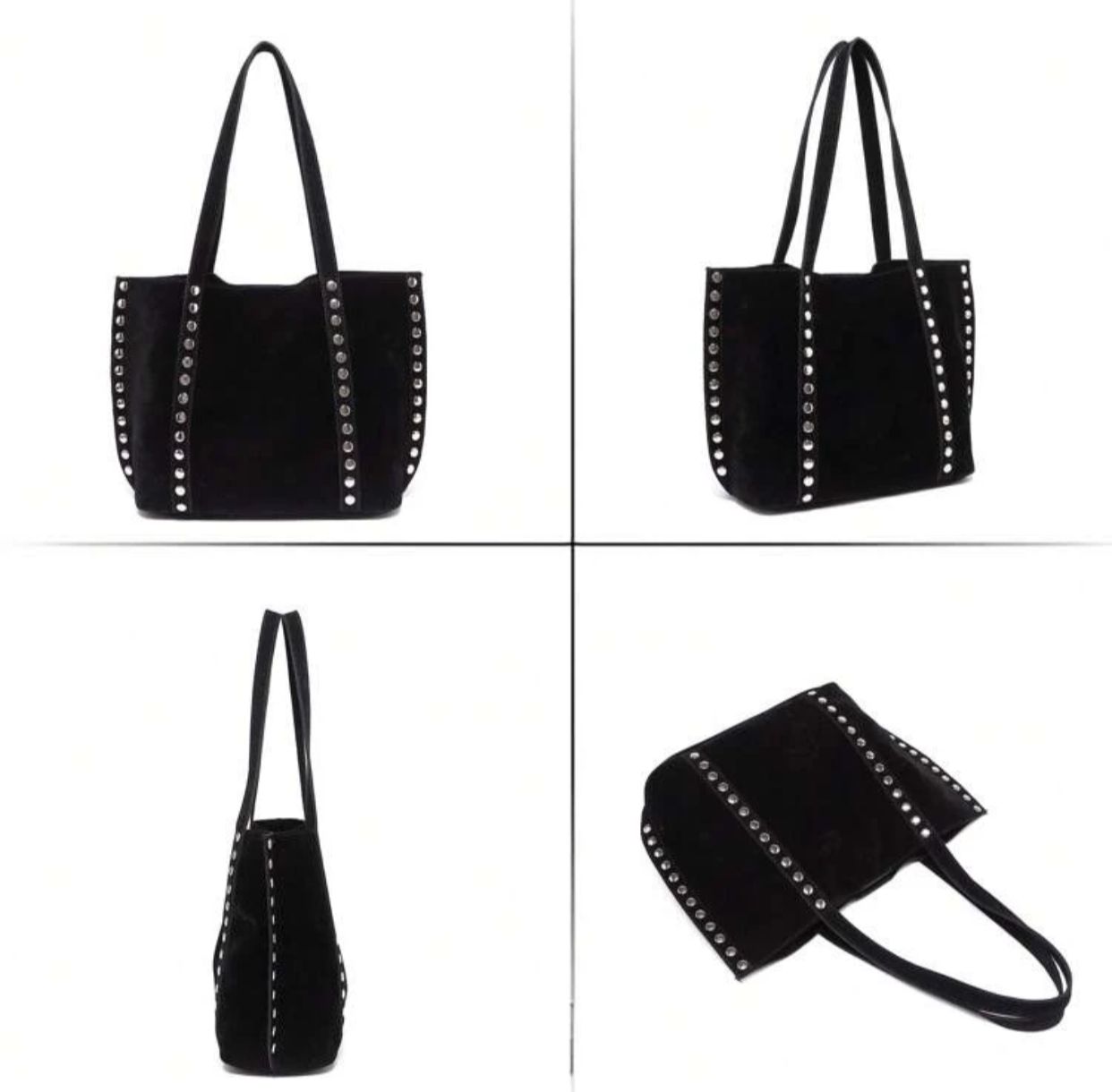 Black Large Capacity Commuter Tote Bag For Women Fashion Rivet Decor Shoulder Bag With Unique Elements Elegant Suede Design Handbag, Suitable For Dating, Daily, Shopping, Beach Vacation And Various Occasions