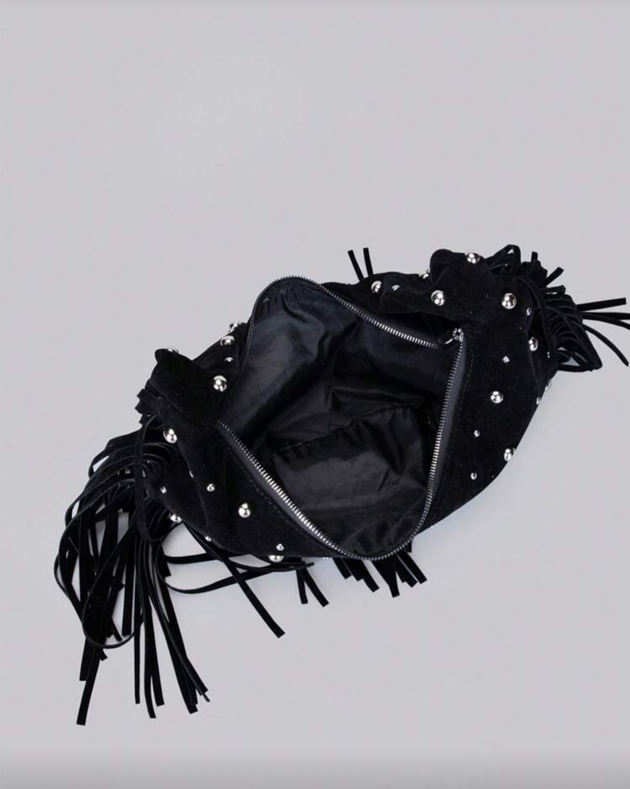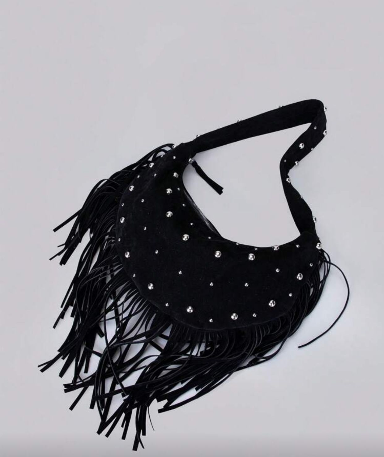 Black Suede Material Rivets Inlaid Tassel Decoration Zip Closure Fashion Modern Quiet Luxury Style Crescent Moon Bag Y2k Punk Style Ladies Shoulder Bag Casual Minimalist Style Stray Bag Suitable