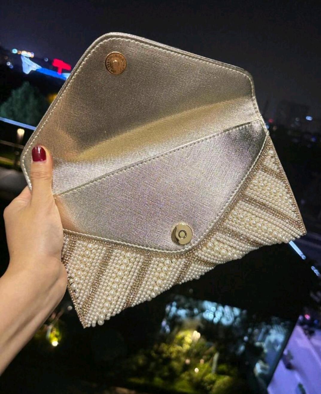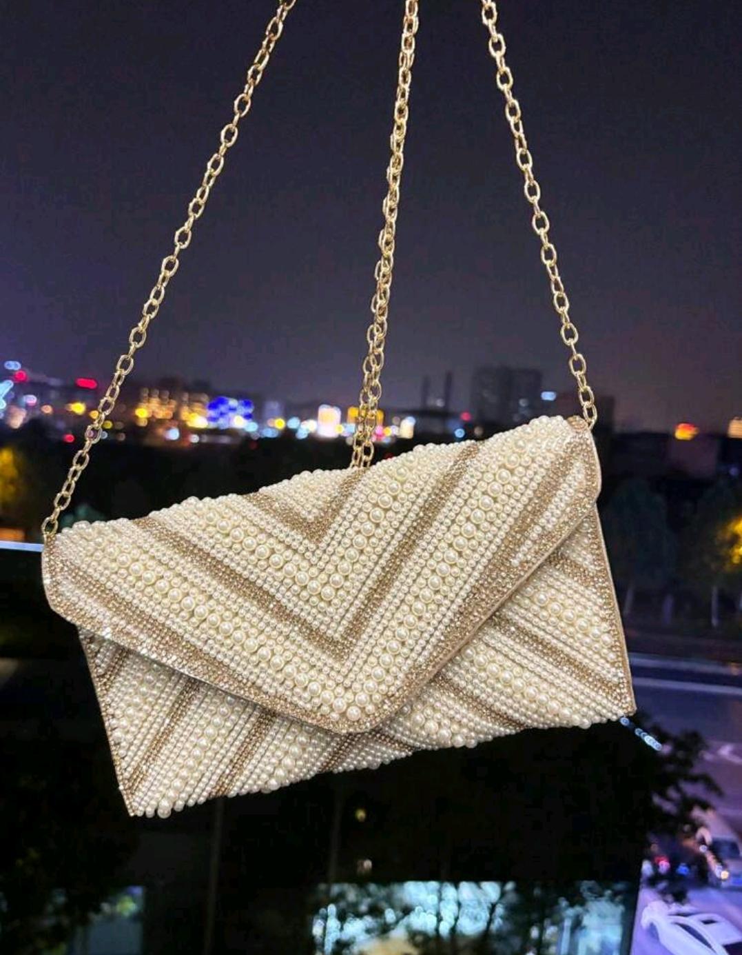 Shiny Pearl & Rhinestone Embellished Clutch Bag For Formal Occasions, With Chain And PU Leather Strap, Elegant Envelope Style Mini Evening Bag, Suitable For Parties And Events