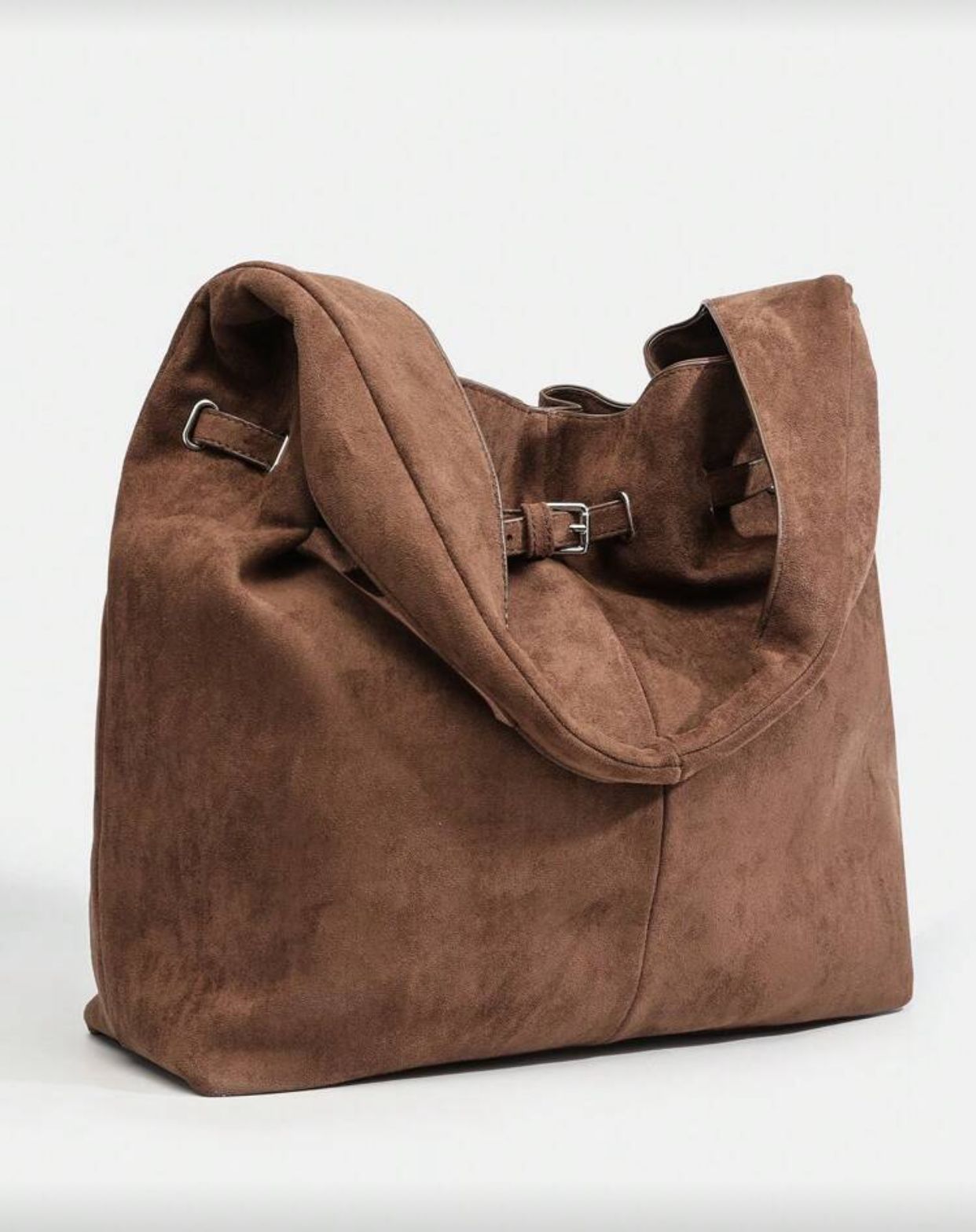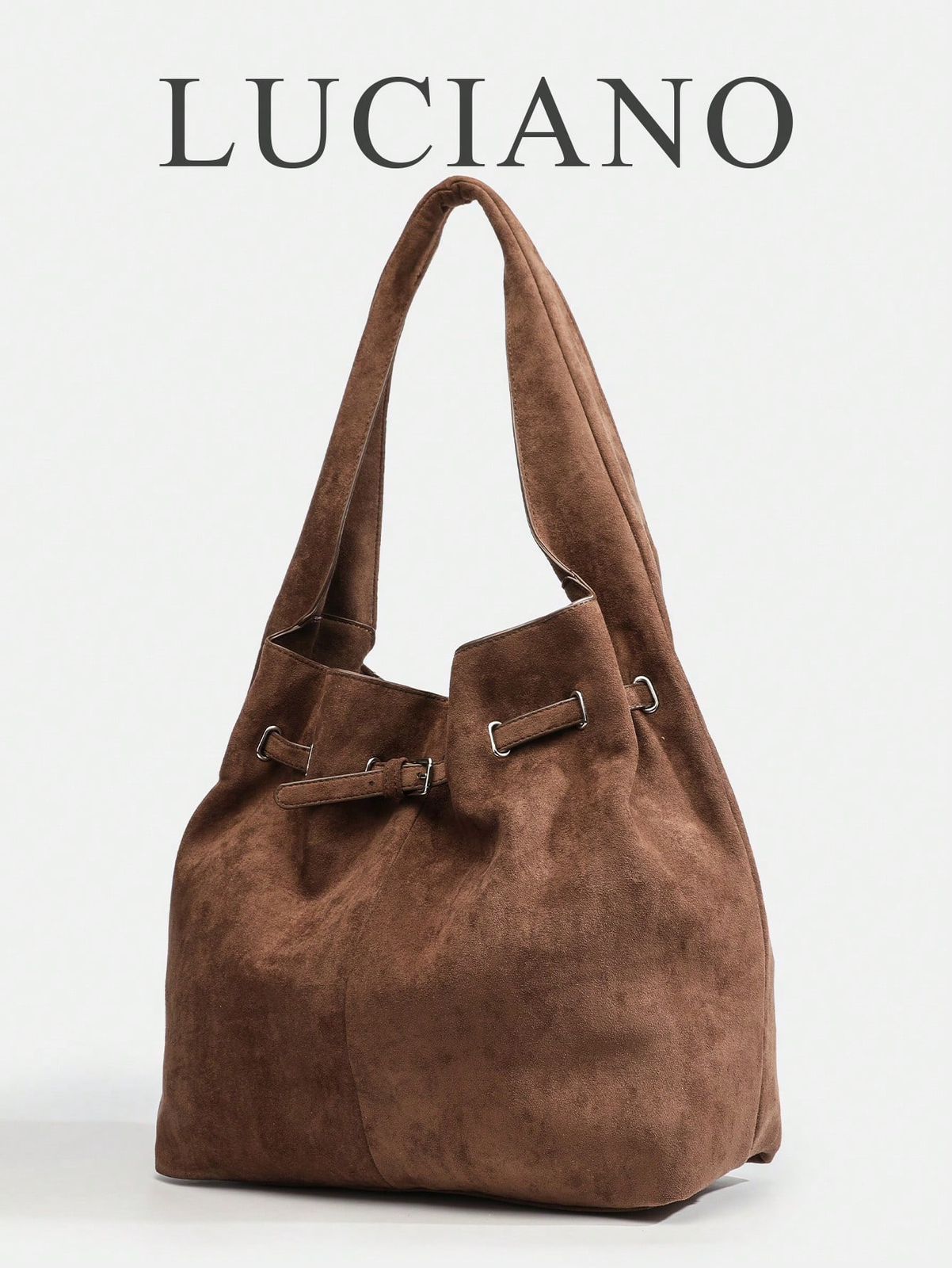 Women's Handbag, Coffee Colored, Retro Metal Buckle Tote Bag, Large Capacity Suede Like Texture French Style Large Capacity Shoulder Bag, Lightweight Metal Buckle Decoration, Western Style, Women's Shoulder Bag, Tote Bag